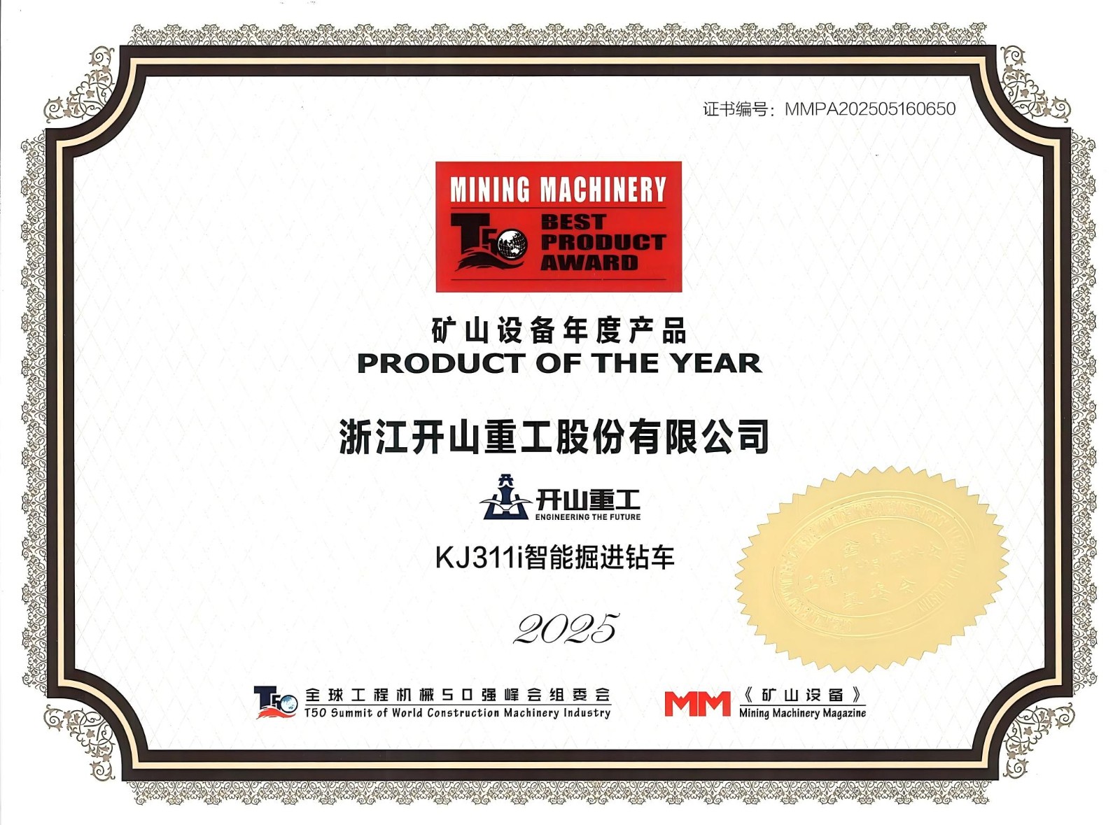 会议期间,一系列中国矿山工程机械行业权威榜单发布,开山重工凭借卓越的产品技术与市场影响力,成功入选“2025中国矿山工程机械专业化制造商50强”与“2025中国矿山设备制造商50强”双榜单,公司自主研发的智能化钻车——KJ311i型智能掘进钻车荣膺“2025矿山设备年度产品”奖项。